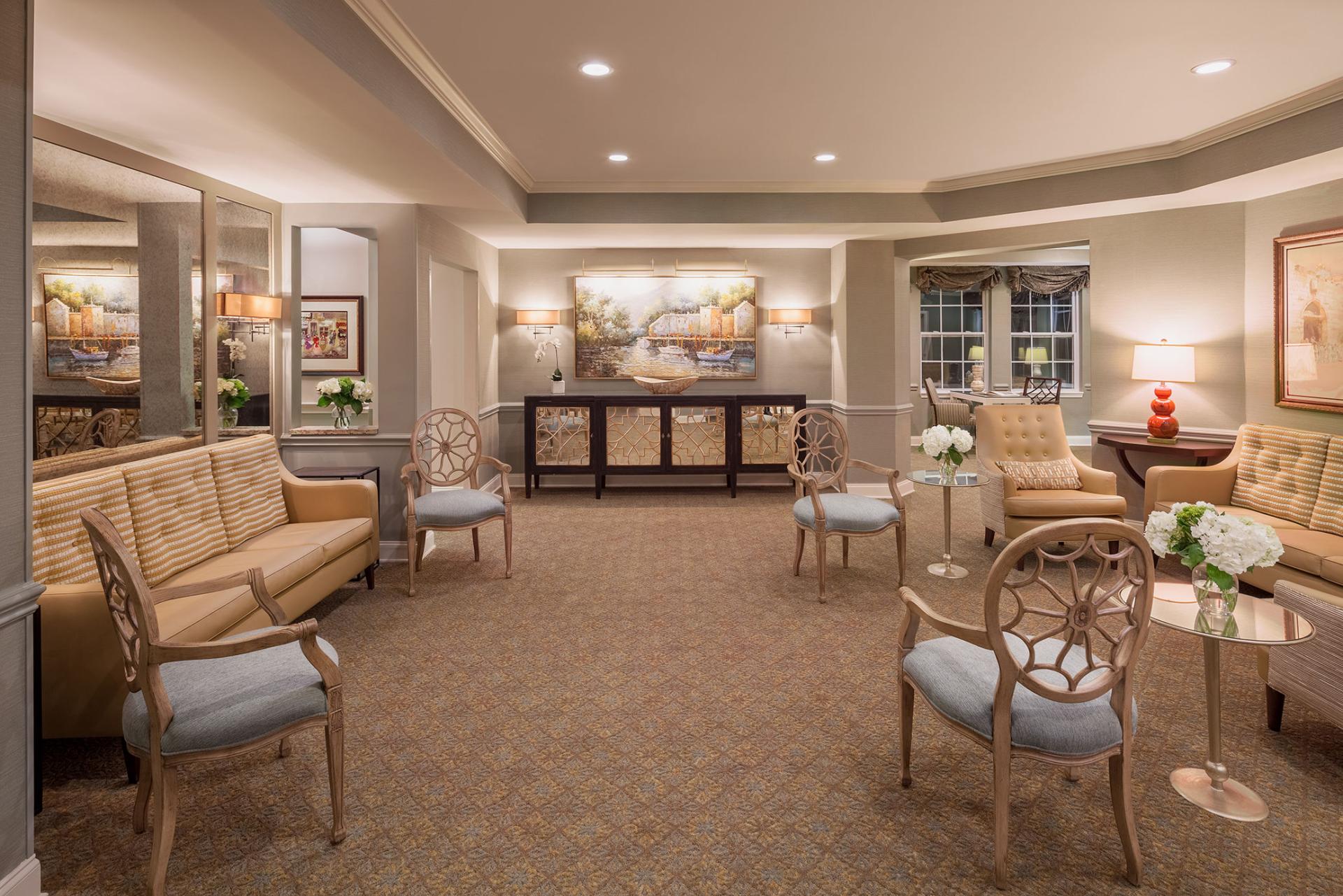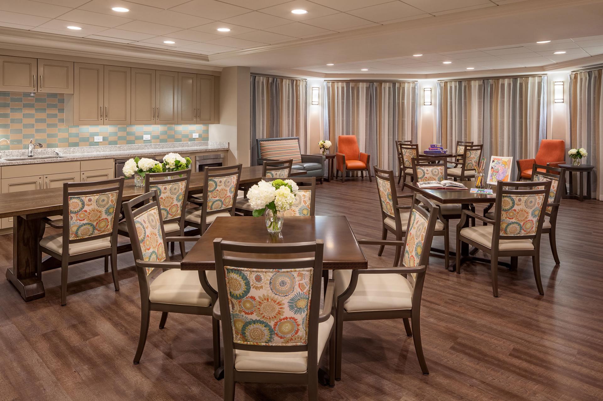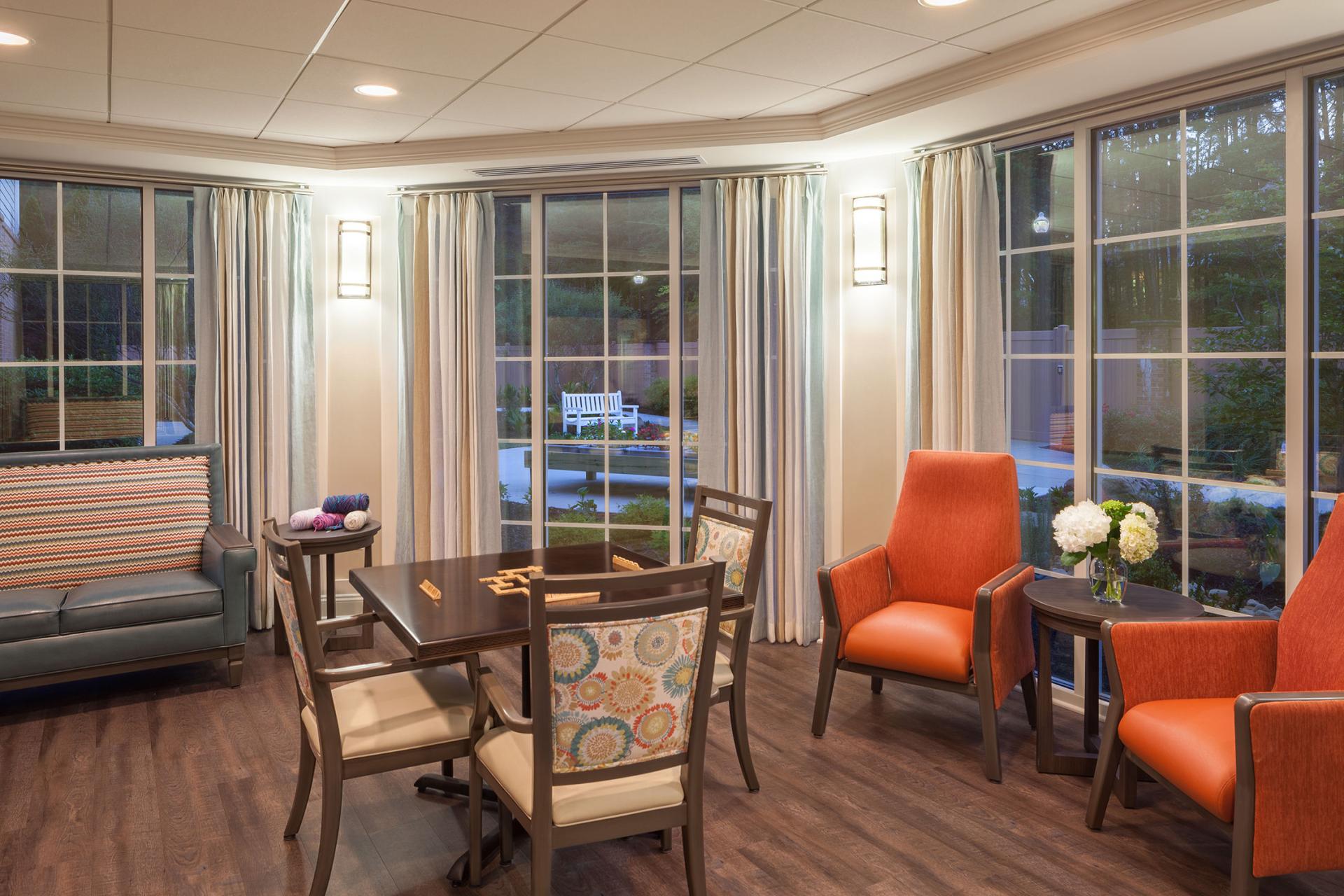 The $2.5 million renovation project included a new porte-cochere, entry vestibule, library, parlor, sales center, extra care room, dining room and activity room. The tight kitchen in the Extra Care Room, in particular, was not functioning well with its limited counter space and underutilized appliances. The design team removed walls and opened up the area, and added a sun room off the existing dining room. When the two existing rooms were combined into one 3-zoned Extra Care Living Area, the residents gained a much-needed multi-functional space that ranges in activities from dining, socializing, and gaming, to quiet reading nooks in the sunroom and late night TV watching in the new comfortable lounge. The courtyard pictured beyond the sun room area includes a wandering path with turn radiuses that are easy to navigate in walkers and wheelchairs. The FF&E selections throughout were purposely made to make the staff’s work easier and more efficient. The fabrics are durable and function well, but are still bright and cheery, adding a residential quality.